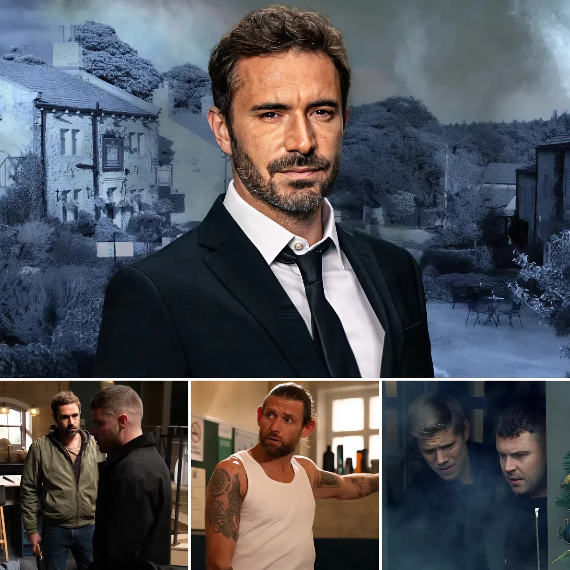A collage of John Sugden in a black suit, in front of a gloomy Emmerdale village.